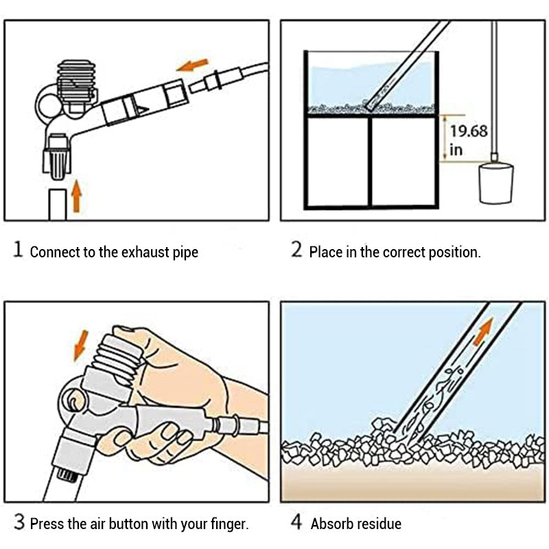 EENVOUDIGE BEDIENING VAN DE LUCHTPOMP ā Druk gewoon op de luchtknop om de waterstroom te starten. Zodra de toevoerleiding gevuld is, start de sifon automatisch, zodat u de reiniger gemakkelijk kunt geleiden voor nauwkeurig onderhoud van het grind.