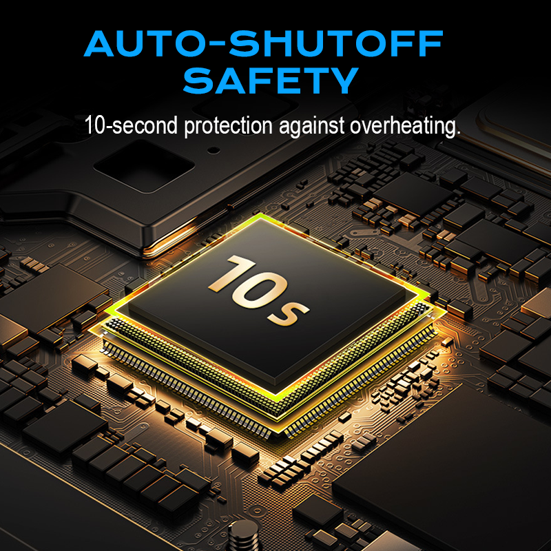 GEAVANCEERDE VEILIGHEIDSFUNCTIES: Uitgerust met een IC-smartchip die automatisch de stroom uitschakelt na 10 seconden continu gebruik, waardoor oververhitting en mogelijke gevaren worden voorkomen. Het verdikte platte wolfraam verwarmingselement wordt geactiveerd via een schuifschakelaar en dooft onmiddellijk wanneer deze wordt losgelaten, dankzij een automatisch terugkeermechanisme.