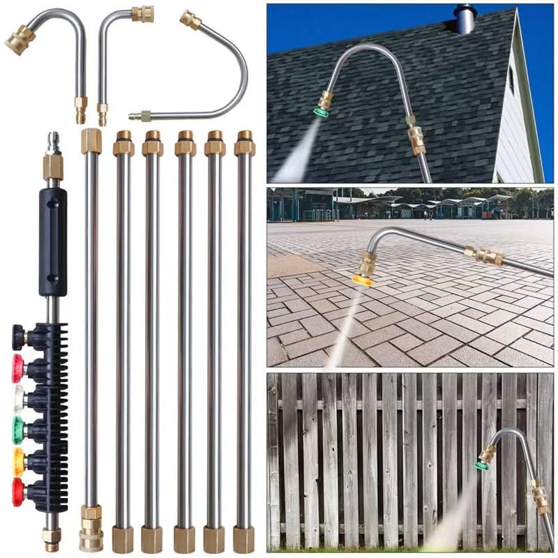 VEELZIJDIGE SPROEIKOPPEN: Onze gootreinigingsset bevat 6 sproeikoppen van hoge kwaliteit, waaronder een zeepsproeikop en sproeikoppen van 40°, 25°, 15° en 0° graden. Deze verschillende maten voldoen aan een breed scala van reinigingstaken, waardoor het geschikt is voor elke klus.