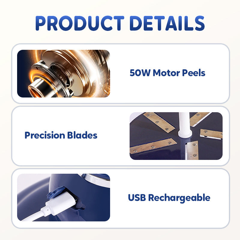 SCHILLEN ZONDER MOEITE, ZONDER ROMMEL - Eén druk op de knop en de machine doet het werk voor je. Perfect geschild fruit in slechts 25 seconden. De krachtige 50W motor werkt stil dankzij slimme koelingstechnologie die oververhitting voorkomt.