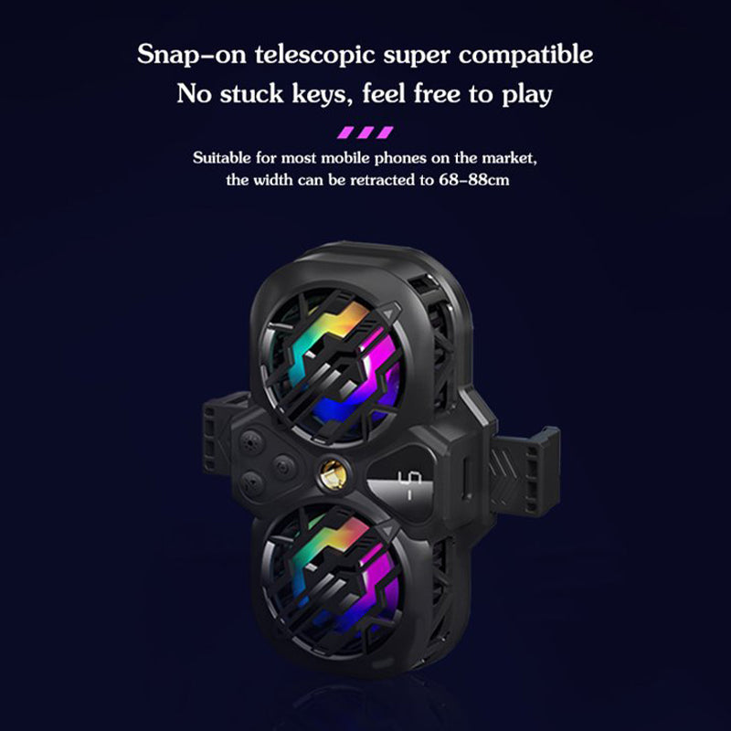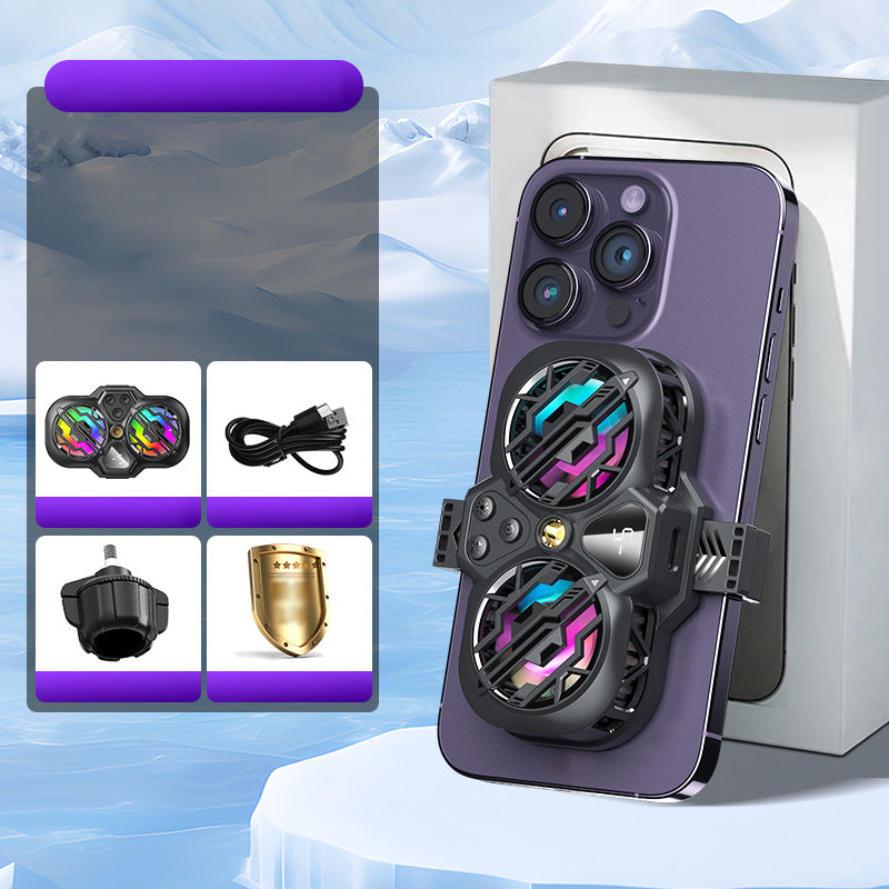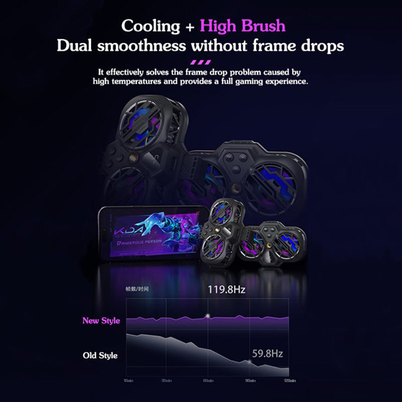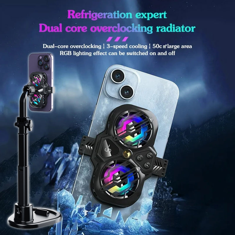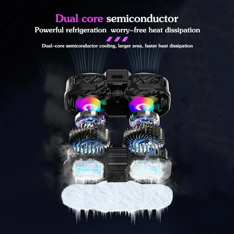 EFFICIËNTE WARMTEAFVOER: De telefoonkoeler maakt gebruik van een dual-core halfgeleider koelchip voor een groter oppervlak en snellere warmteafvoer, zodat je apparaat koel blijft tijdens lange gamesessies of intensief gebruik.